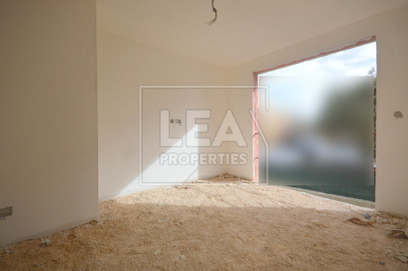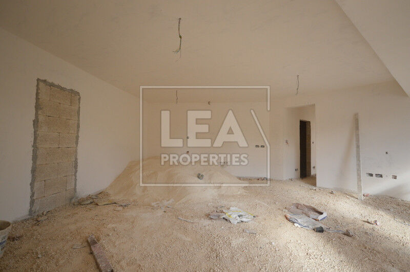Measuring 84sqm of internal space, the property enjoys a bright and airy atmosphere, enhanced by its squarish open-plan layout and large apertures that flood the interiors with natural light while offering picturesque valley views.